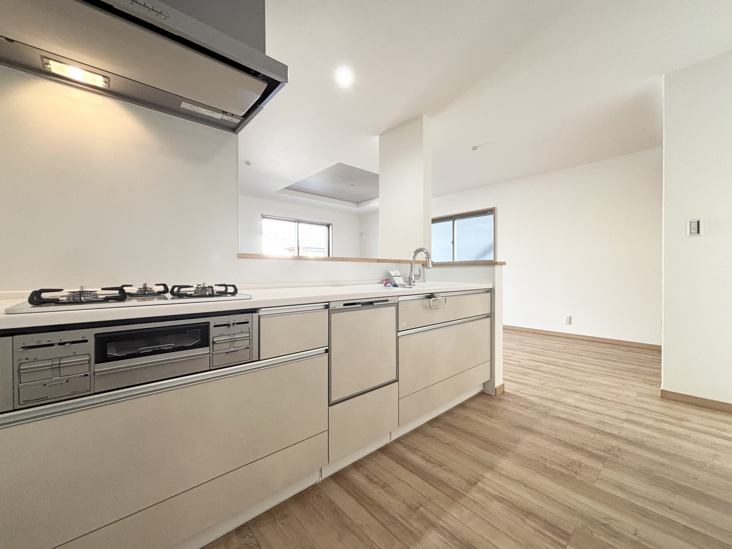 ・食器洗乾燥機やタッチレス水栓が備えられたキッチン。